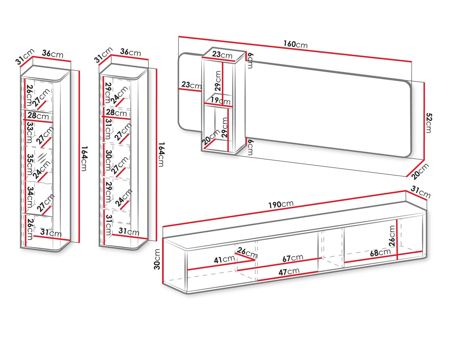 Függő polcméretek164 x 36 x 31 x 160 x 20 cm