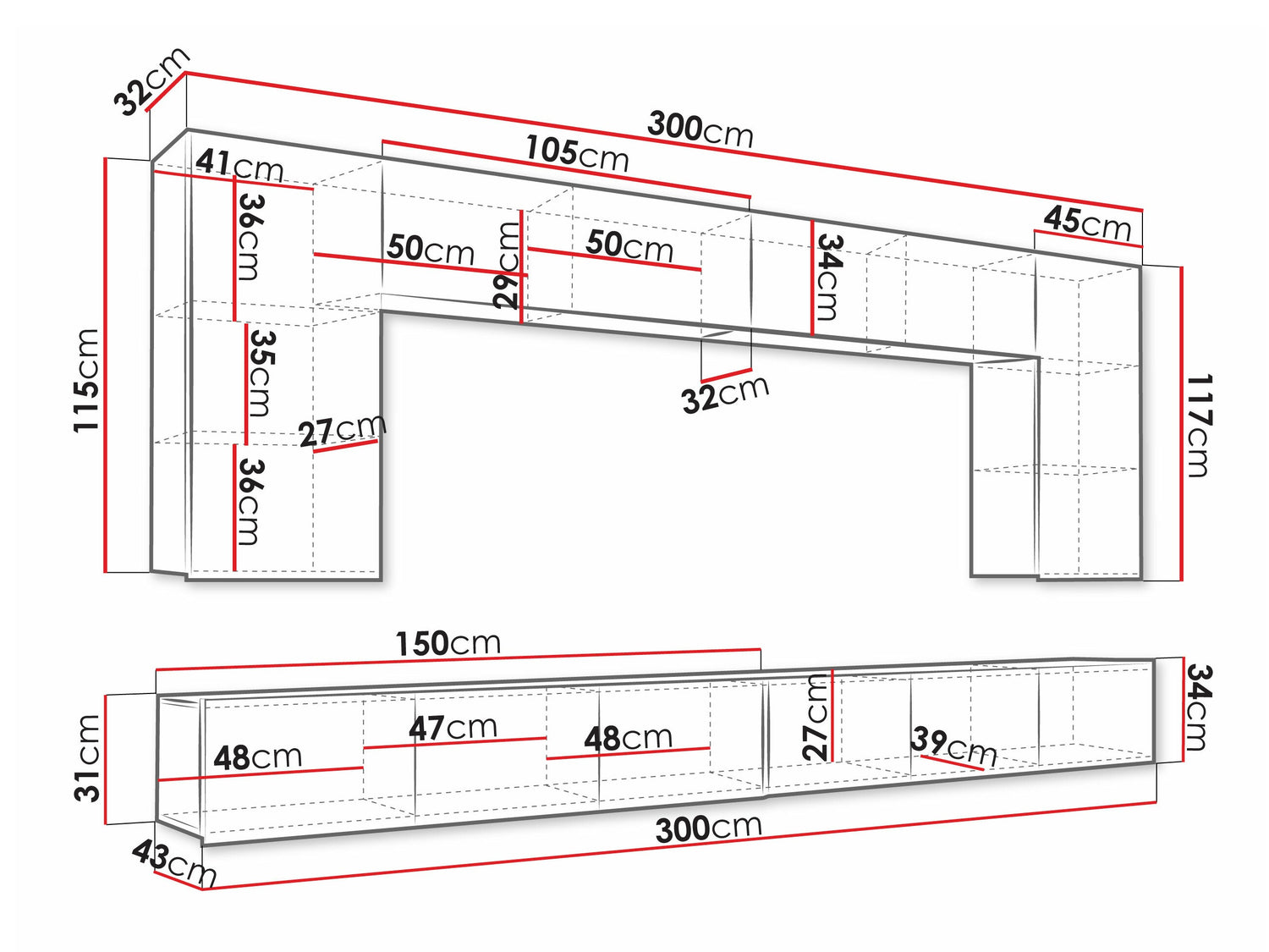 TV asztal méretei34 x 300 x 43 cm