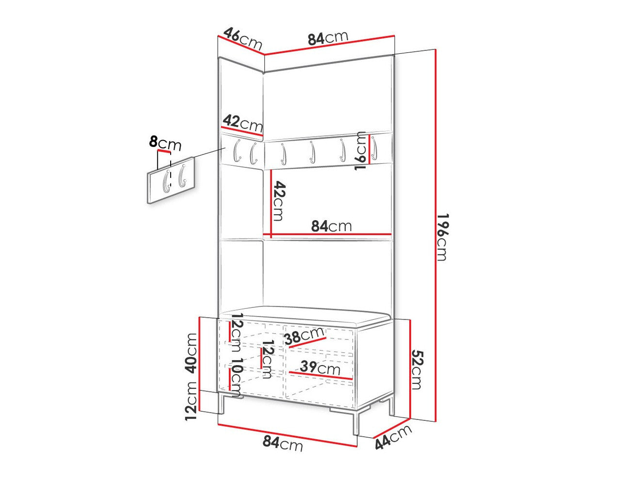 Akasztó méretei16 x 84 x 8 x 42 x 8 cm