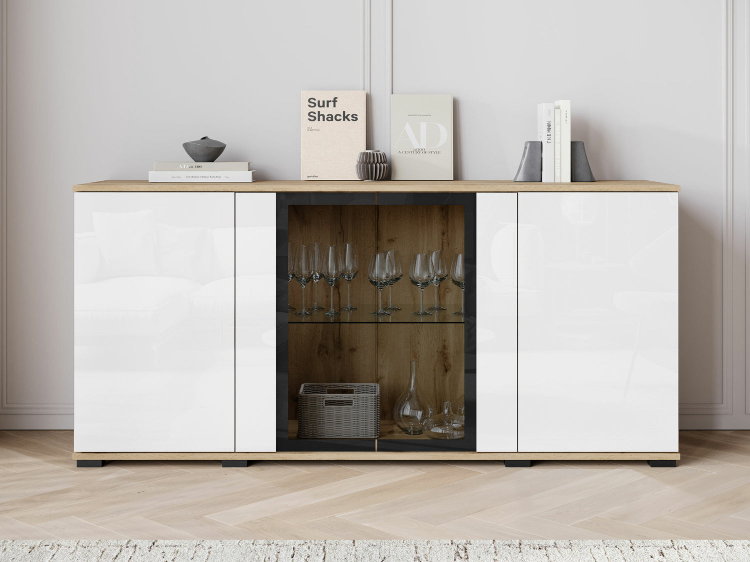 Szekrény CARO SB 154, Szín: Wotan tölgy + Fényes fehér, -világítás: Nem