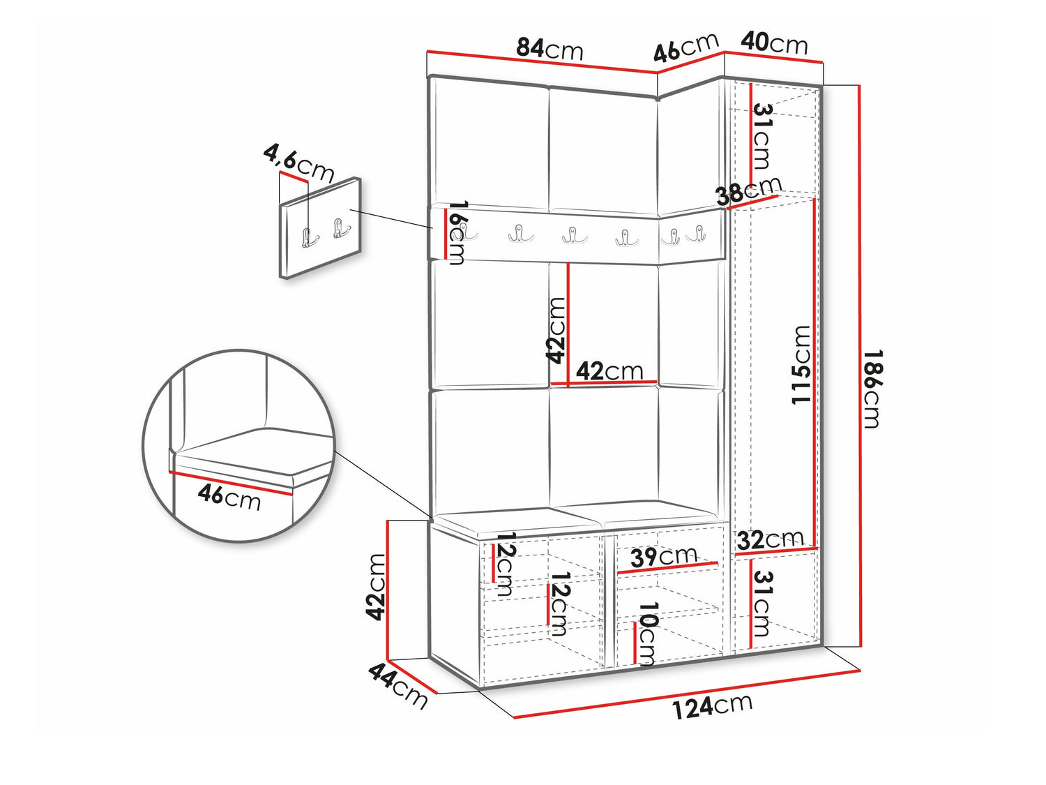 A szekrény méretei186 x 40 x 46 cm