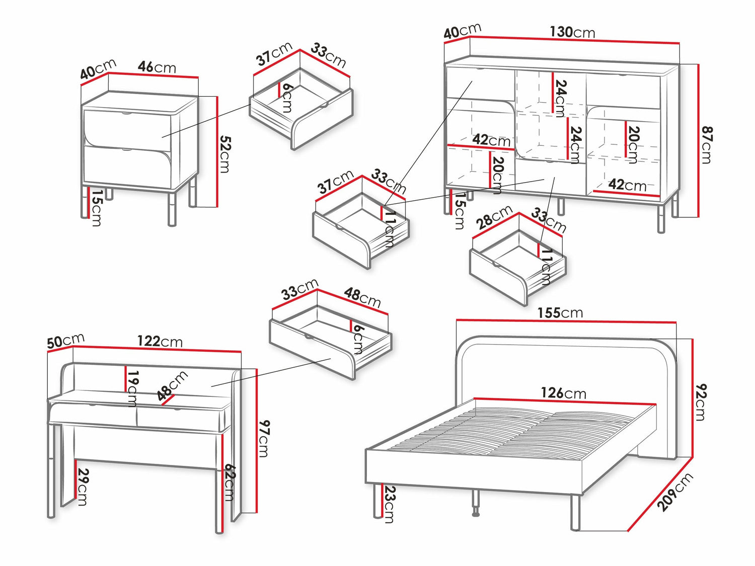 Ágykeret méretei92 x 155 x 209 cm