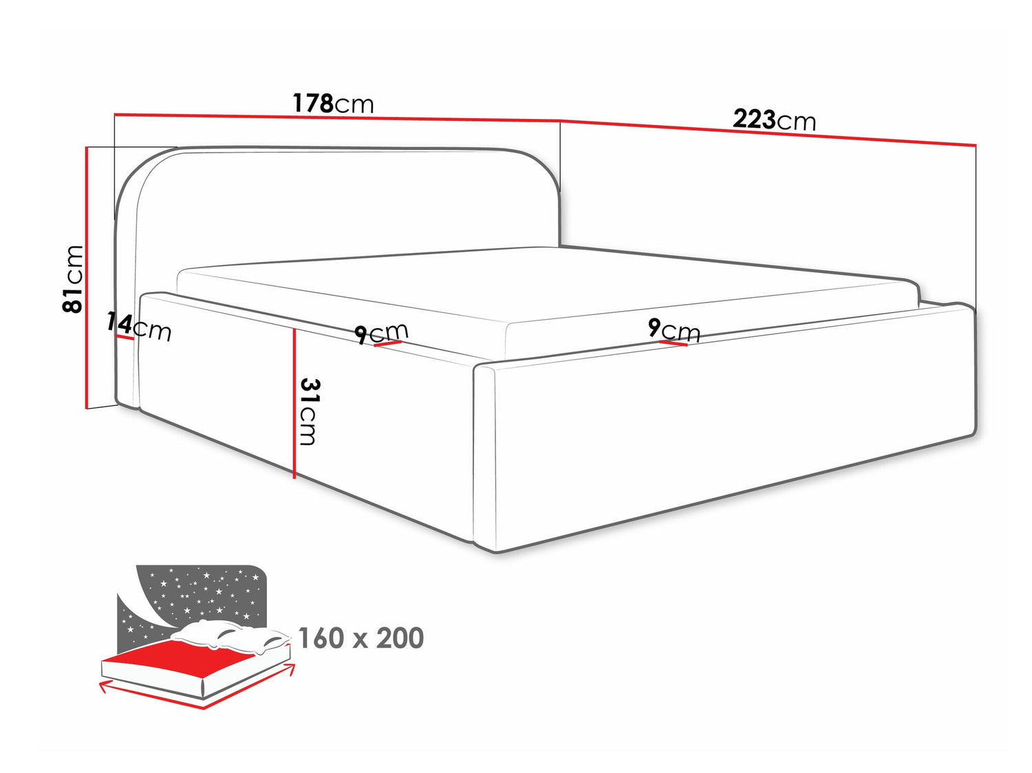Ágyneműtartó méretei16 x 160 x 200 cm