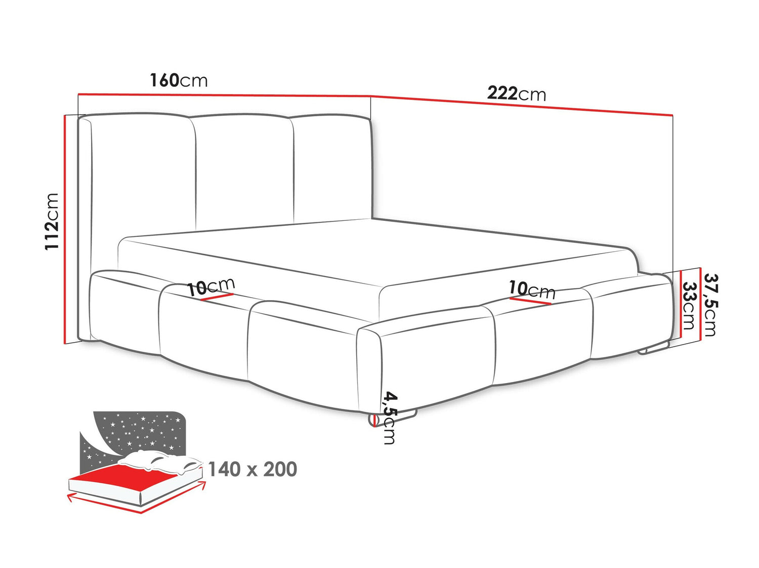 Ágyneműtartó méretei16 x 140 x 200 cm