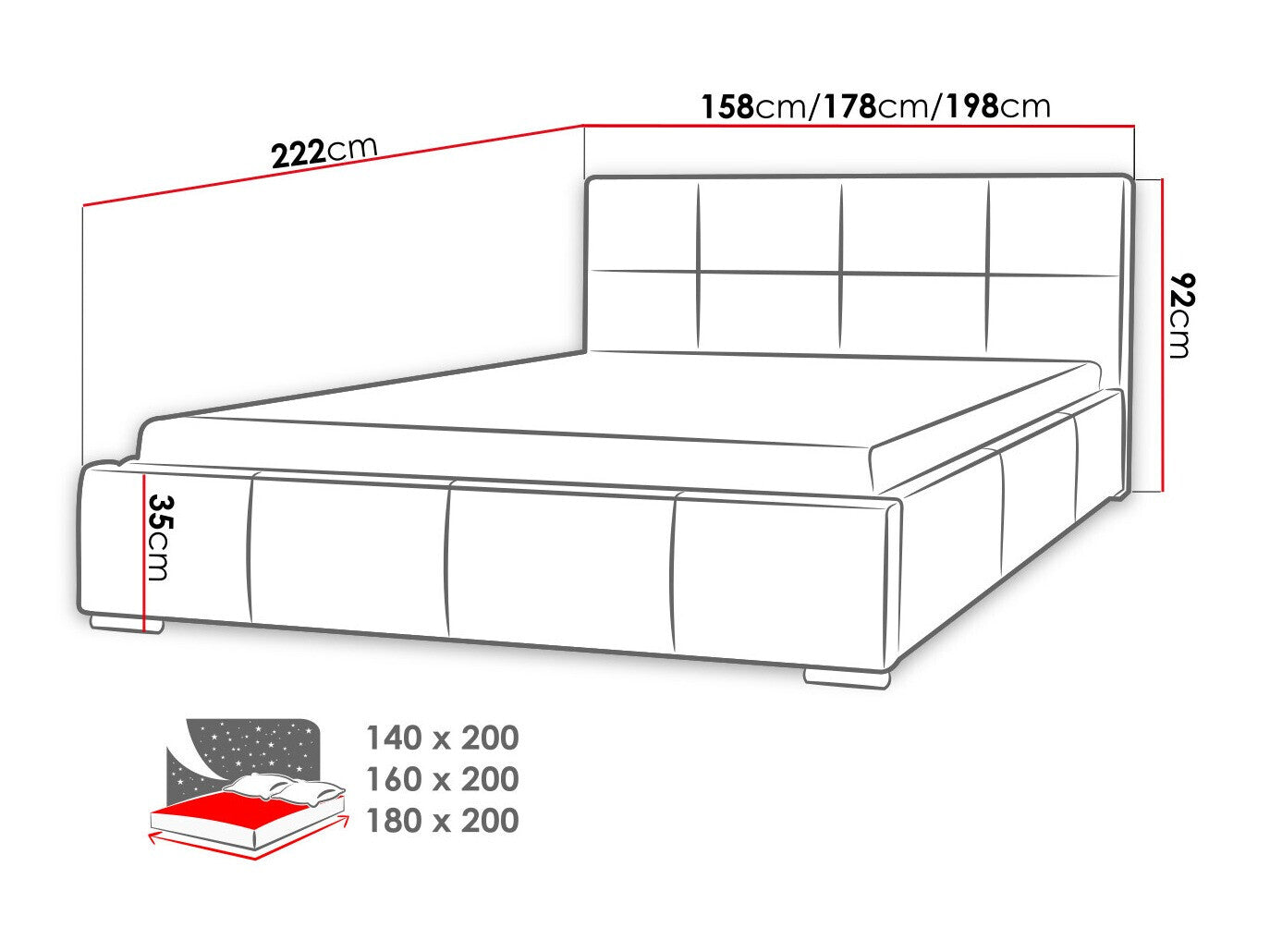 Ágyneműtartó méretei17 x 198 x 68 cm
