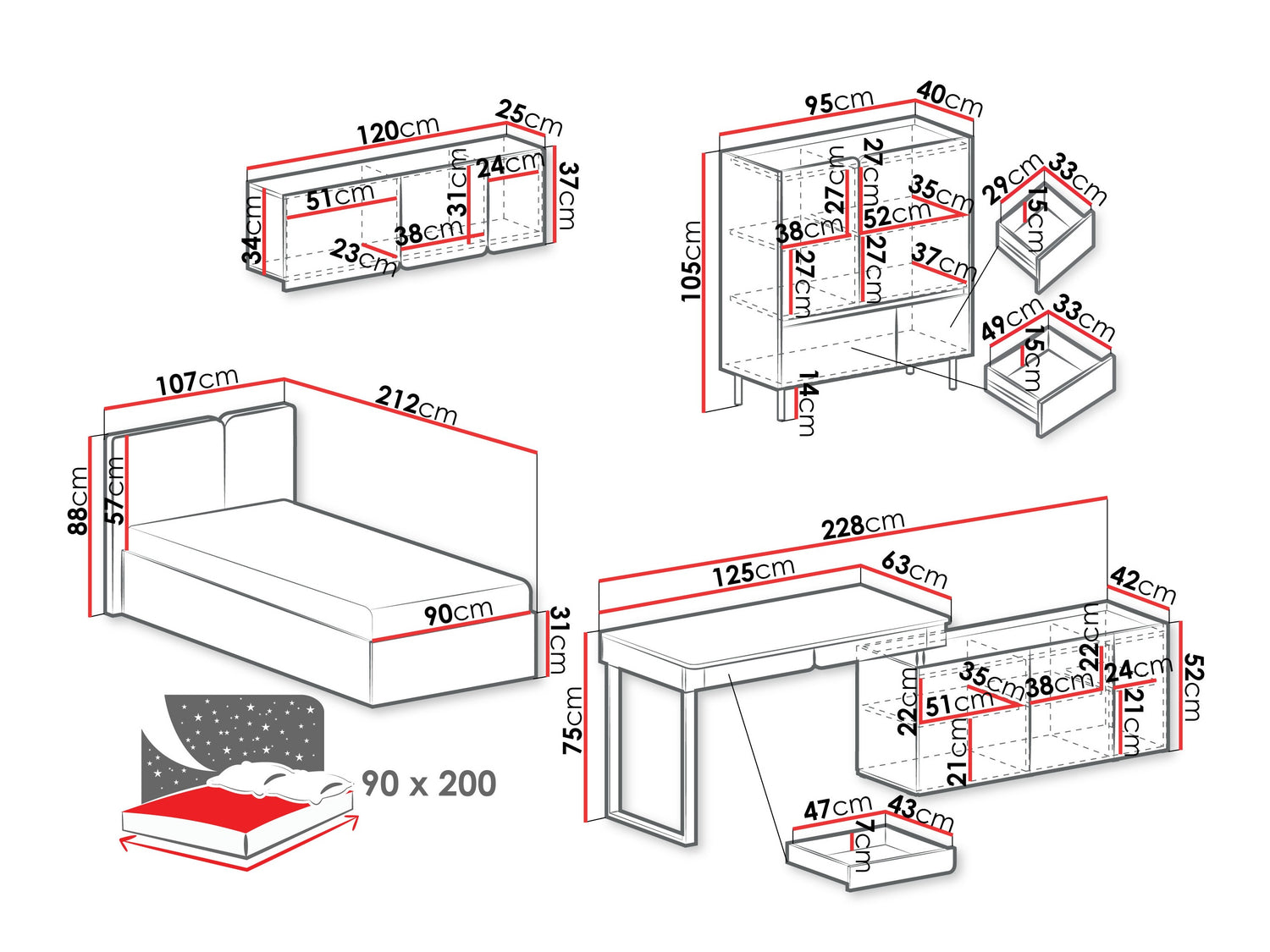Ágyneműtartó méretei15 x 90 x 201 cm