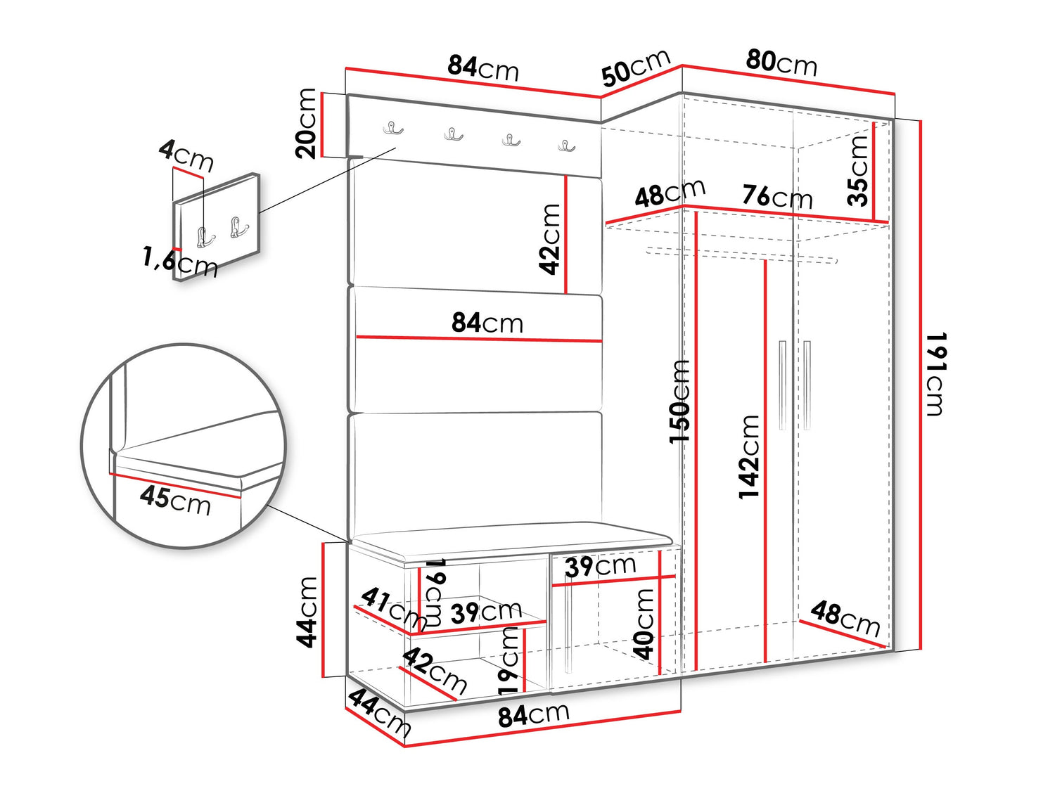 A szekrény méretei191 x 80 x 50 cm