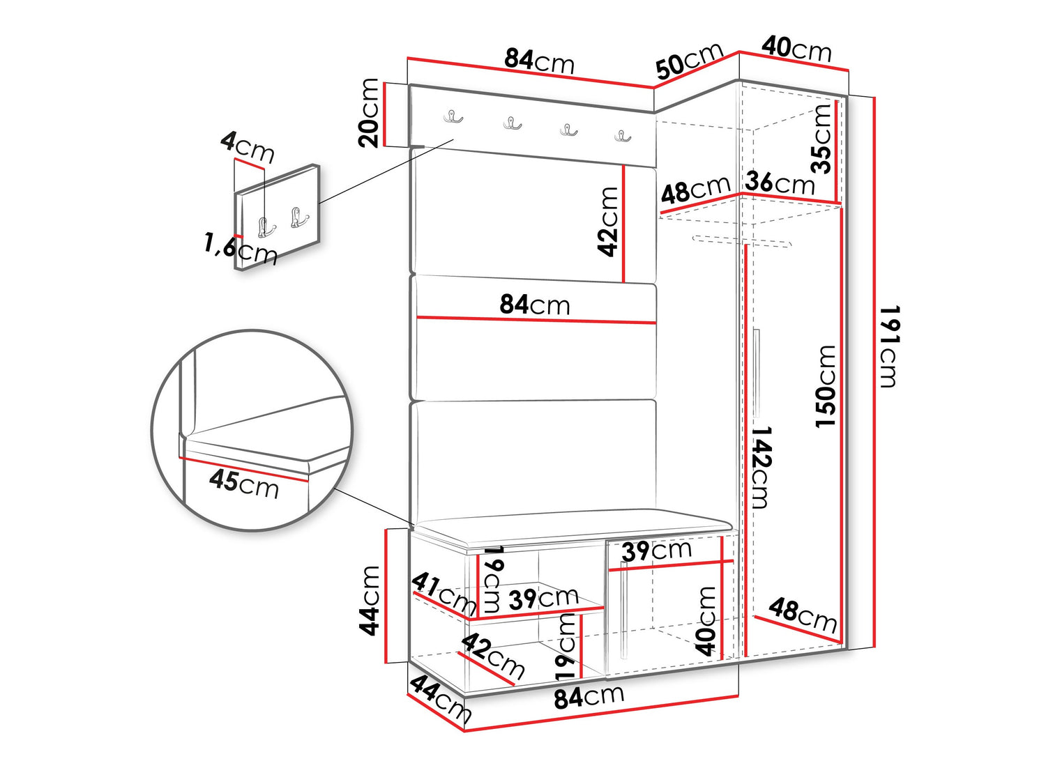 A szekrény méretei191 x 40 x 50 cm