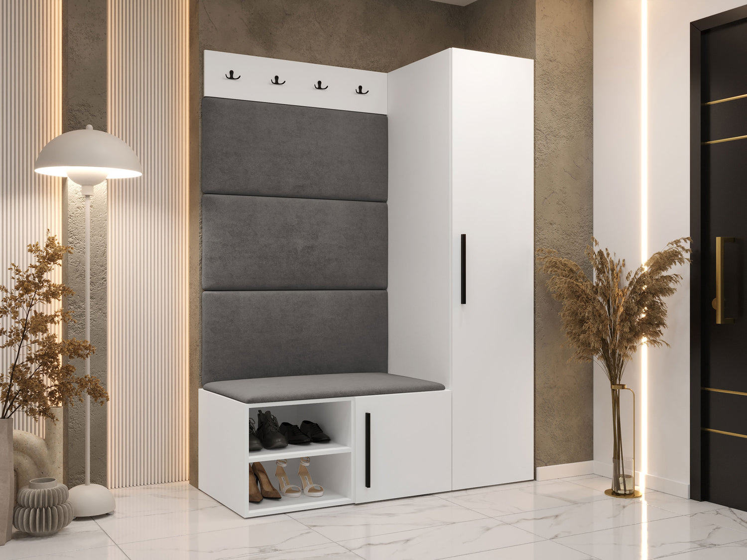 Előszoba garnitúra Garderoba MEDI II, Keret színe: Fehér, Puha falpanel színe: Manila 16
