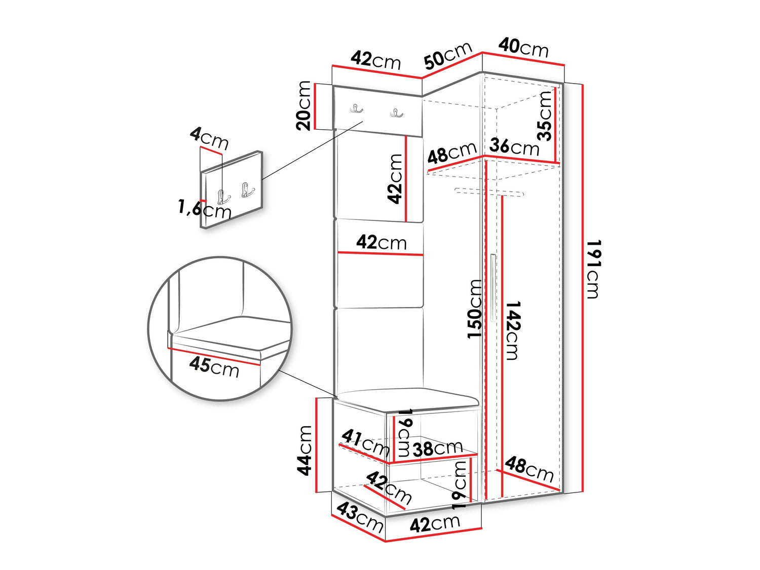 A szekrény méretei191 x 40 x 50 cm
