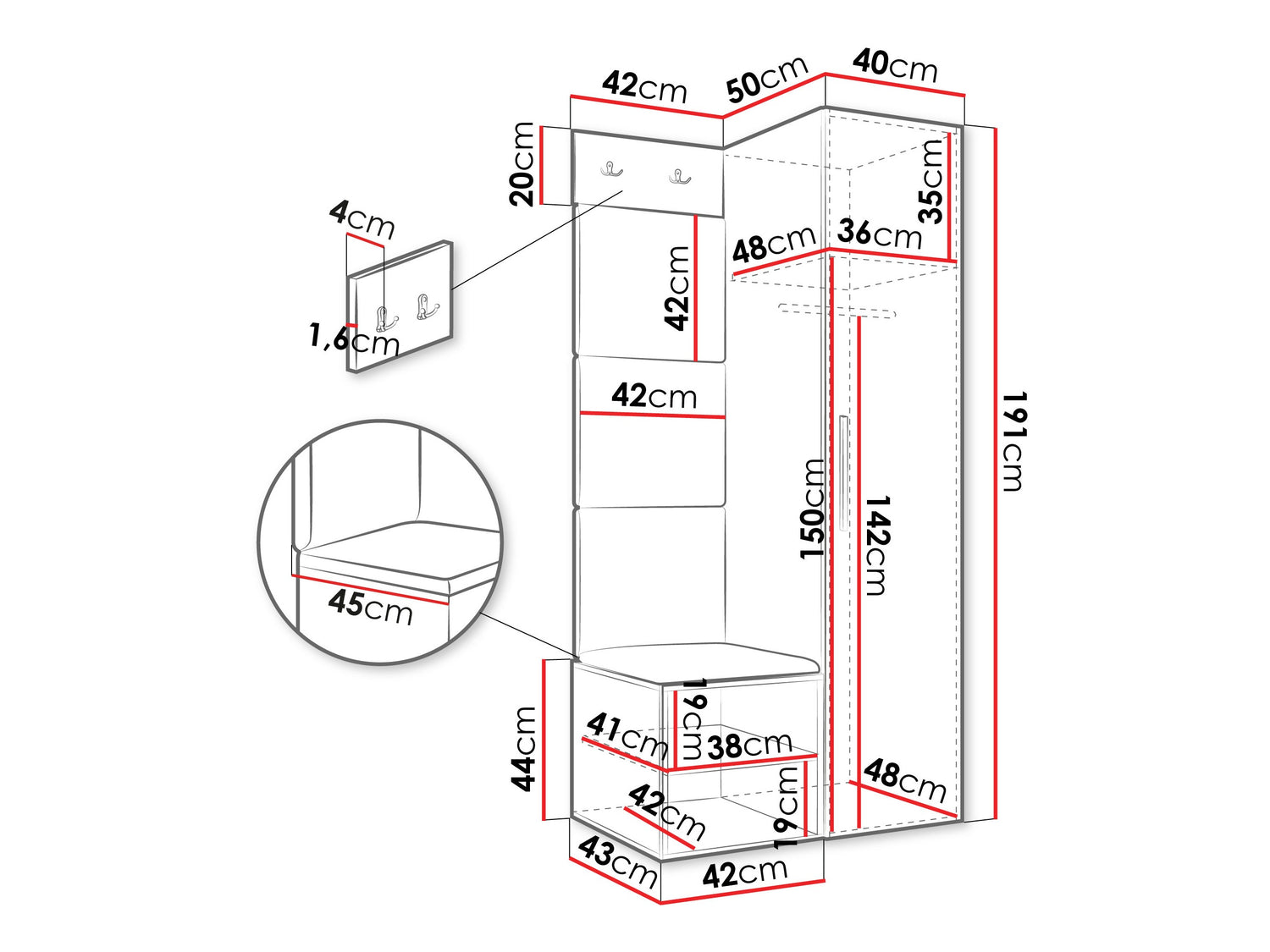A szekrény méretei191 x 40 x 50 cm