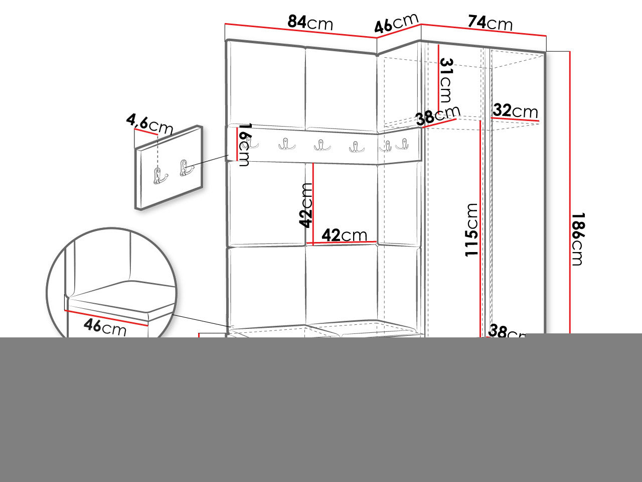 A szekrény méretei186 x 74 x 46 cm