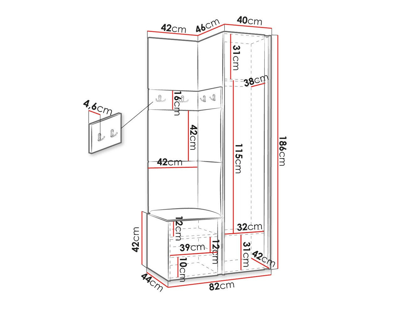 A szekrény méretei186 x 40 x 44 cm