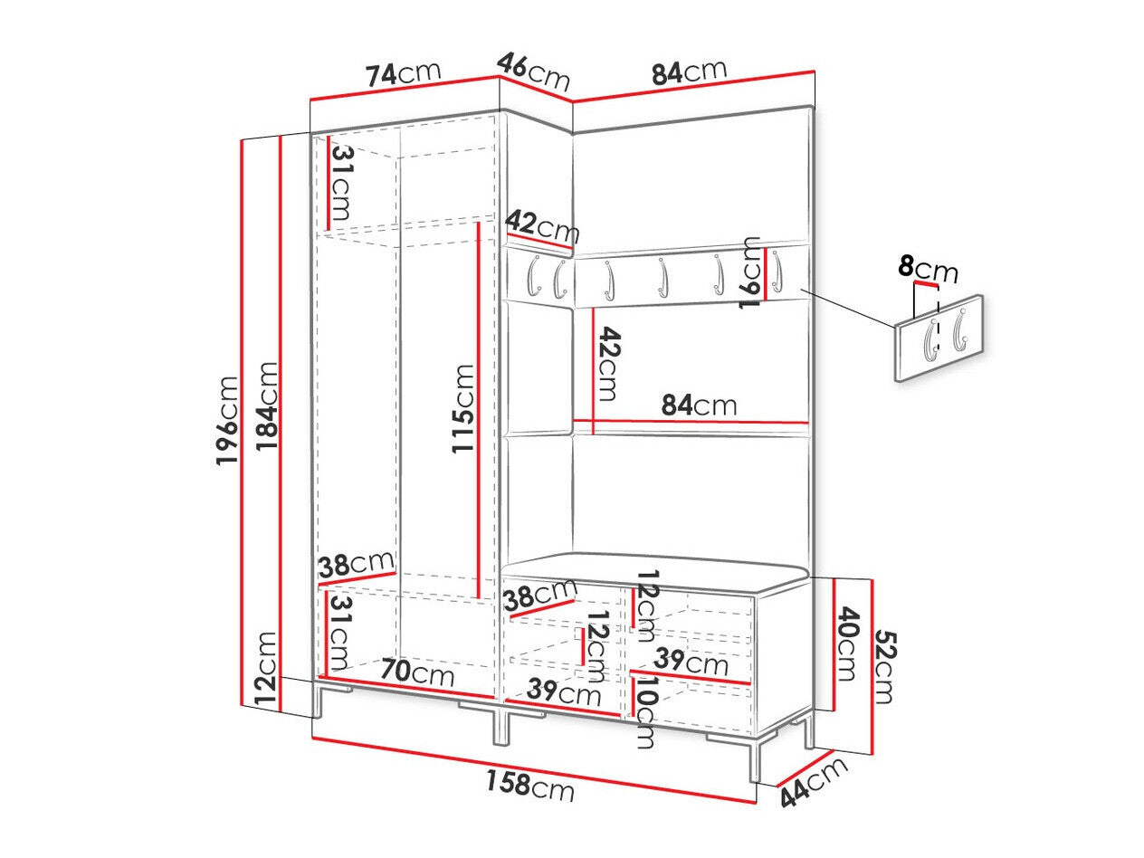 Akasztó méretei16 x 84 x 8 x 42 x 8 cm