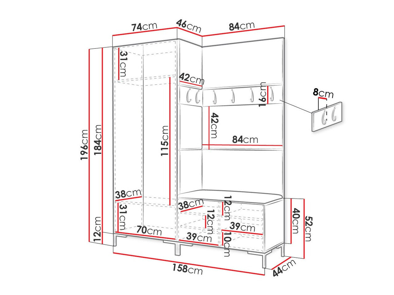 Akasztó méretei16 x 84 x 8 x 42 x 8 cm