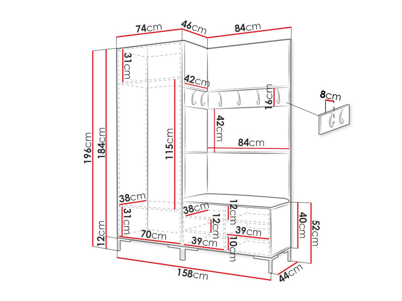 Akasztó méretei16 x 84 x 8 x 42 x 8 cm