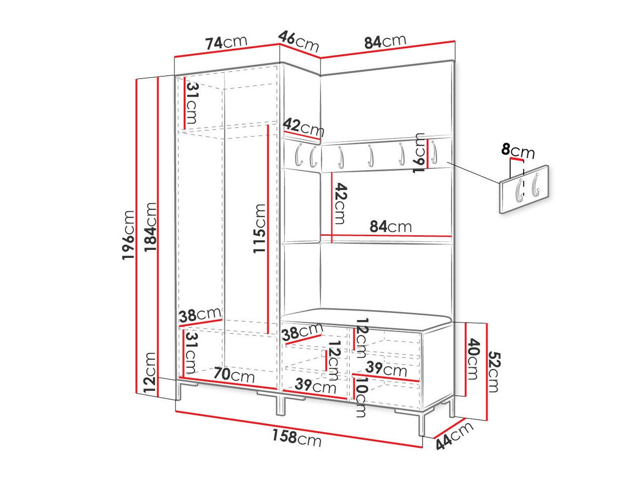 A szekrény méretei196 x 74 x 46 cm