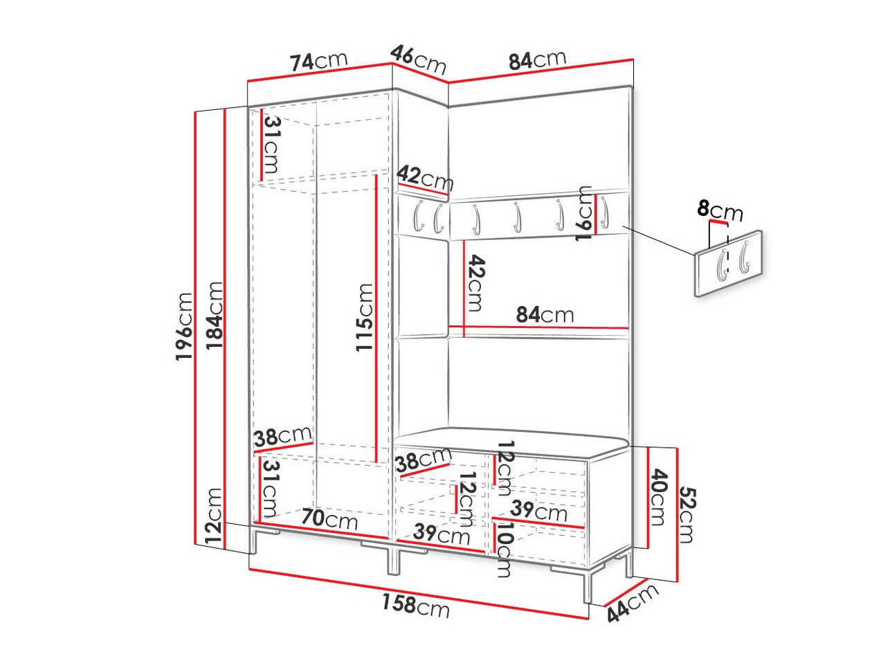 Akasztó méretei16 x 84 x 8 x 42 x 8 cm