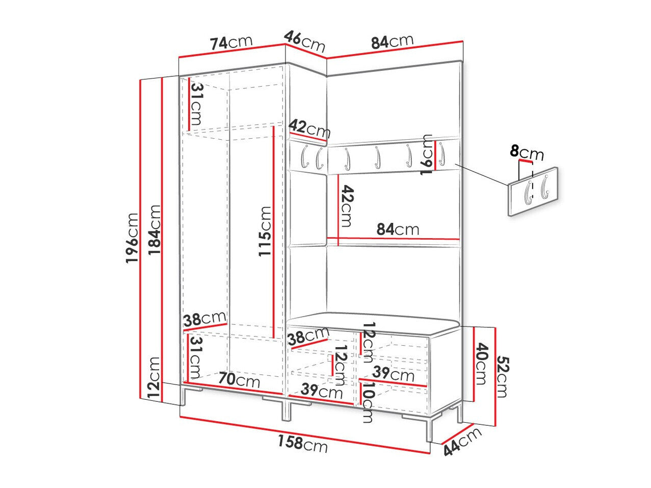 Akasztó méretei16 x 84 x 8 x 42 x 8 cm