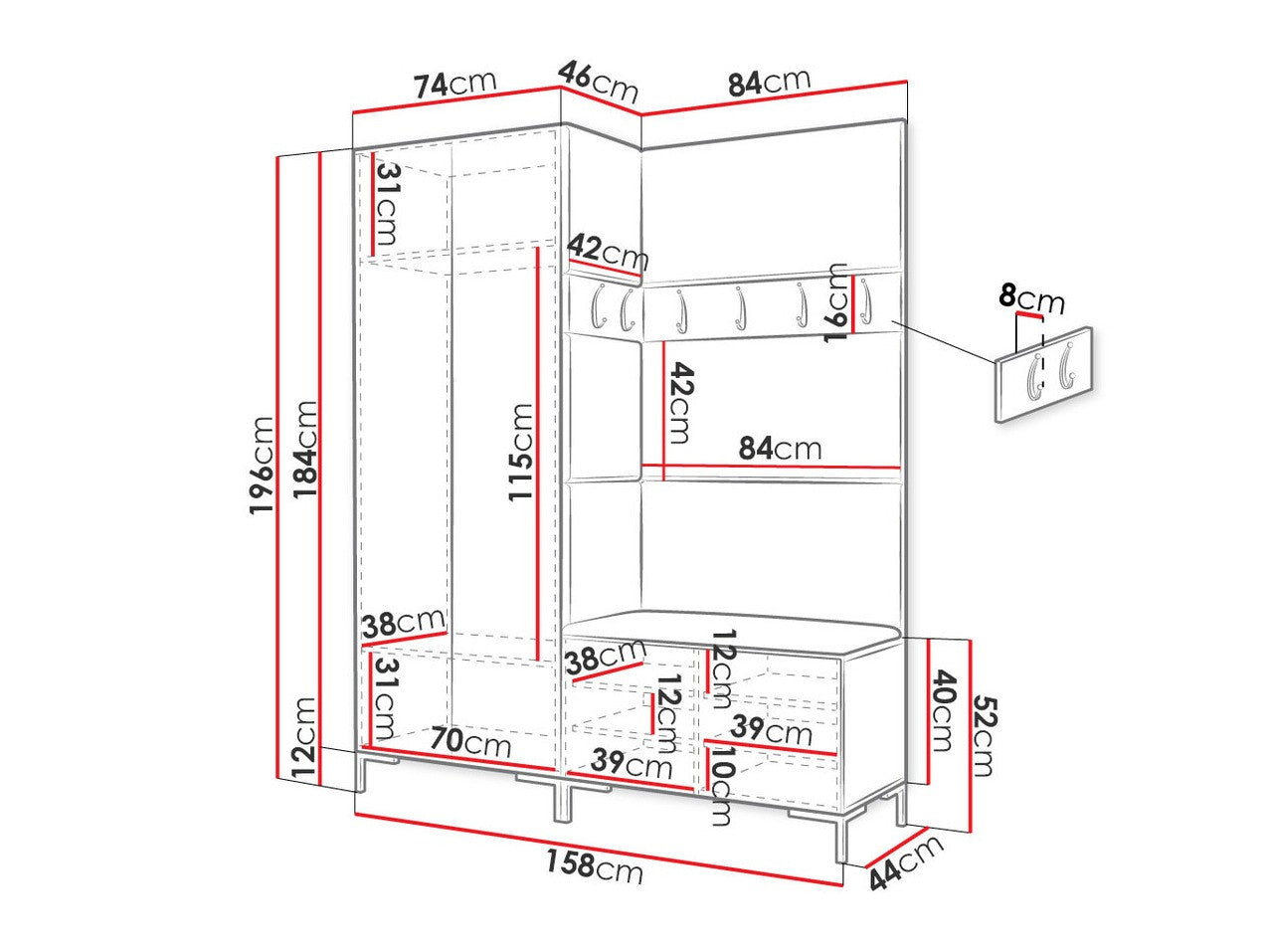 Akasztó méretei16 x 84 x 8 x 42 x 8 cm