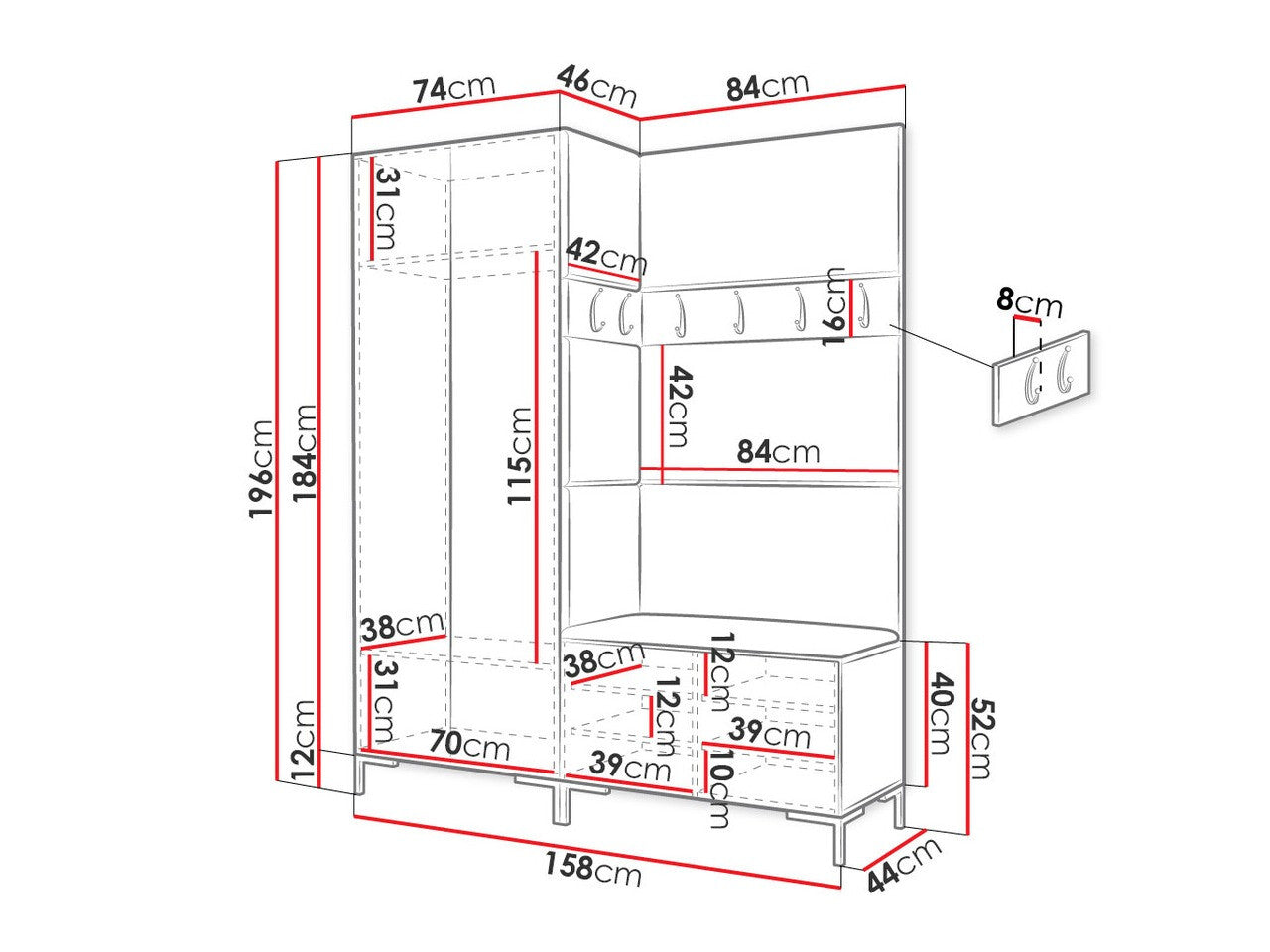 A szekrény méretei196 x 74 x 46 cm