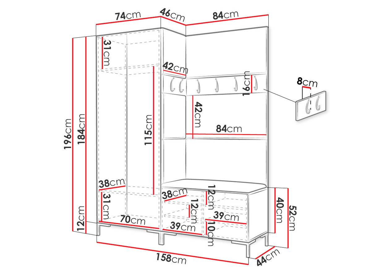Akasztó méretei16 x 84 x 8 x 42 x 8 cm