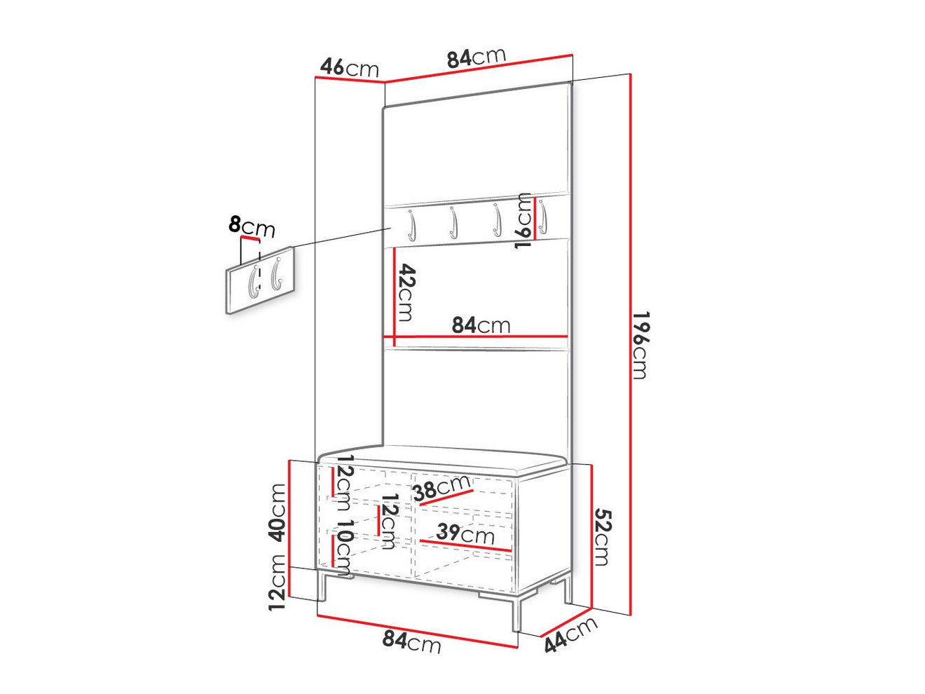 Akasztó méretei16 x 84 x 8 cm