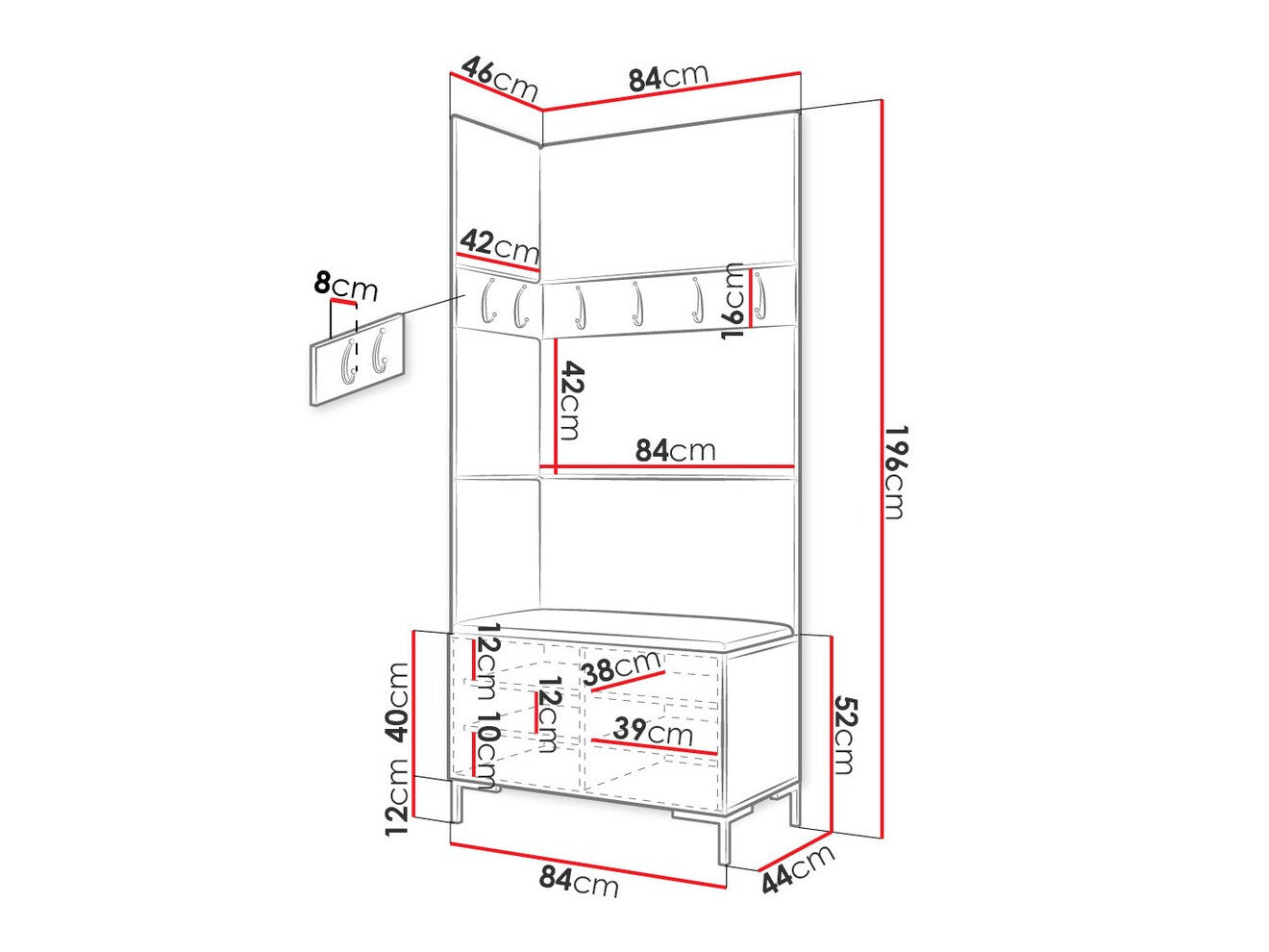 Akasztó méretei16 x 84 x 8 x 42 x 8 cm