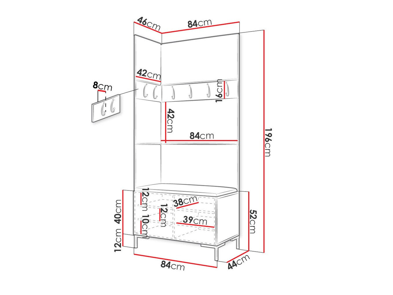 Akasztó méretei16 x 84 x 8 x 42 x 8 cm