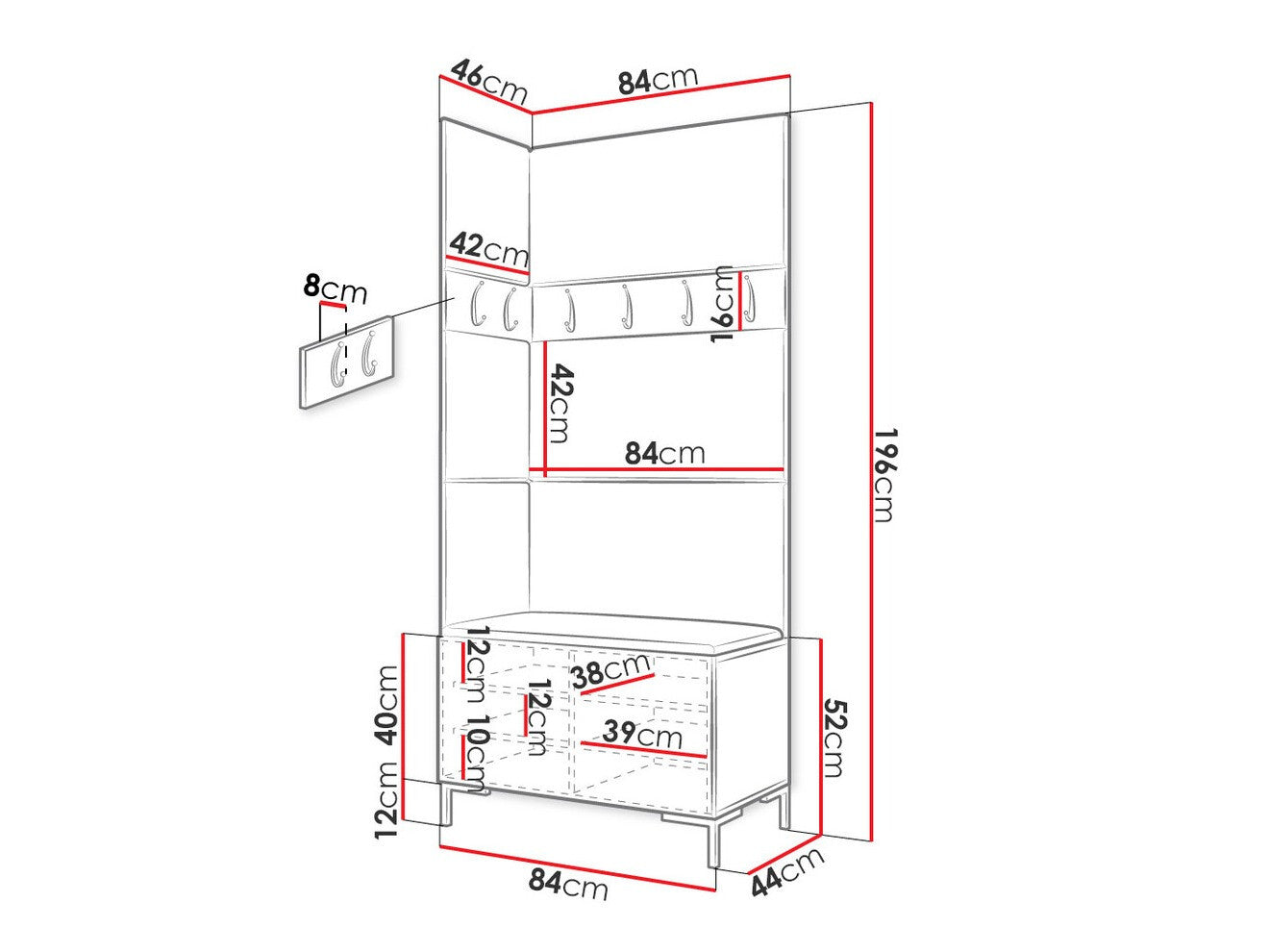 Akasztó méretei16 x 84 x 8 x 42 x 8 cm