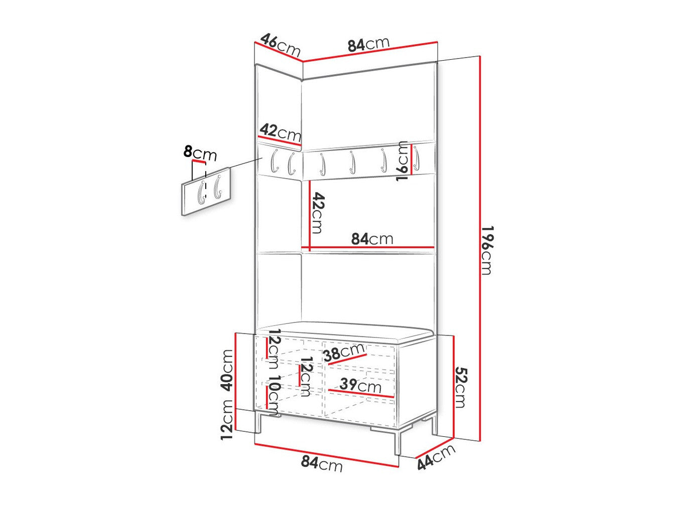 Akasztó méretei16 x 84 x 8 x 42 x 8 cm
