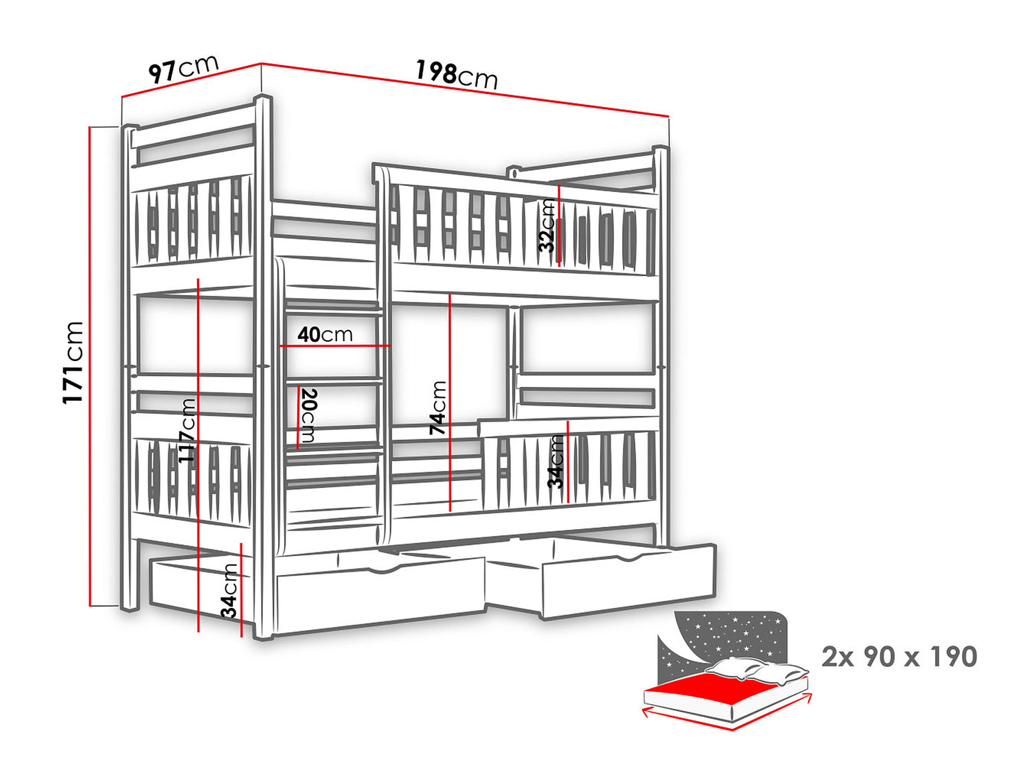 Emeletes ágy MONIKA (William), Szín: Kasmír, Alvó felület mérete: 90 x 190 cm