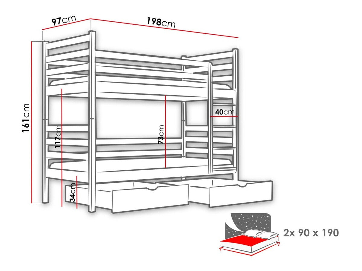 Emeletes ágy Nemo (Aero), Szín: Fenyő, Alvó felület mérete: 90 x 190 cm