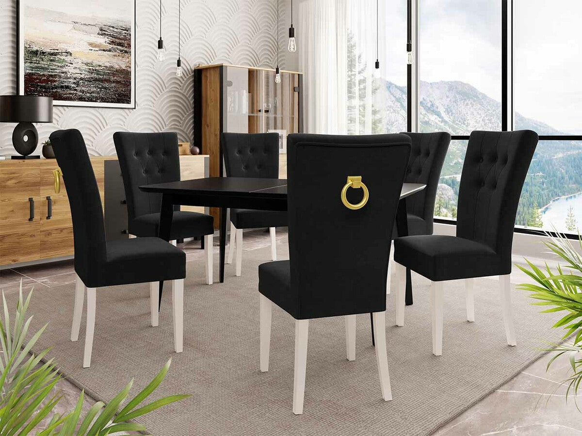 Étkezőgarnitúra Zestaw 09 6xS67 SKANDI 140x80, Szék színe: Fehér + Magic Velvet 2219, Asztal színe: Barna, Színes dekorációk: Aranysárga