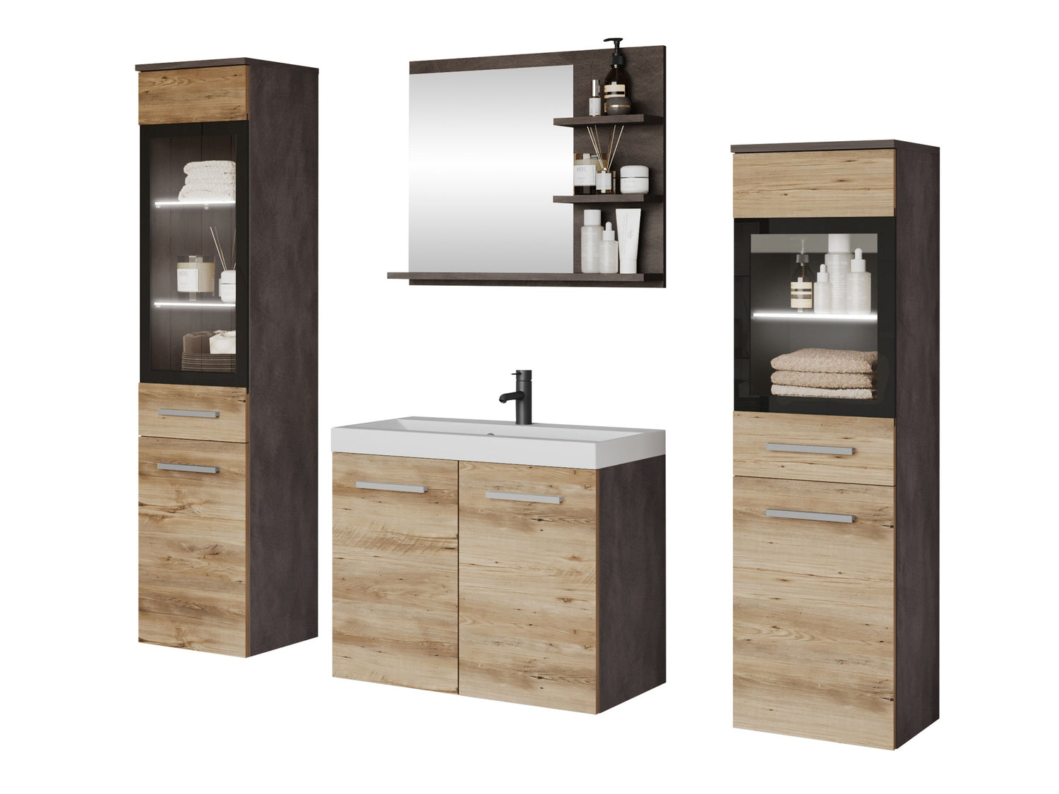Fürdőszoba garnitúra MADRIT I, Szín: Matera szürke + Gesztenye, Led világítás: Igen fehér