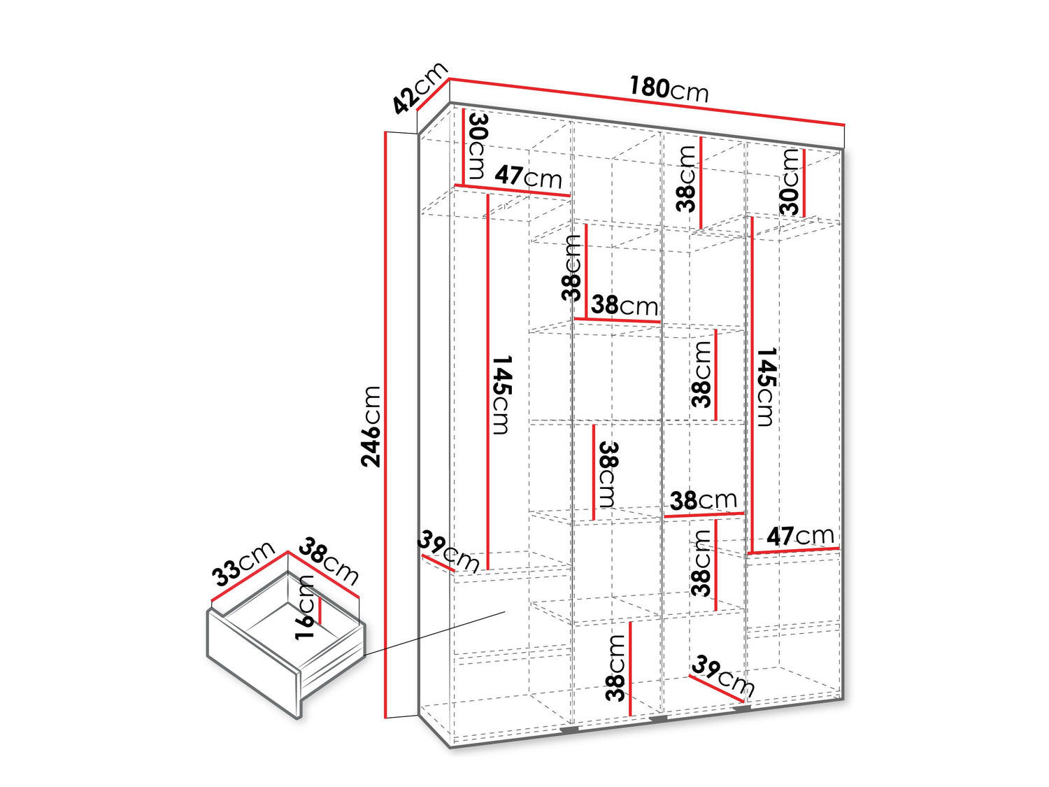 Gardróbszekrény Szafa COMO 1 170/180/190/200 (gł.42.52), Szín: Fehér, Fogantyú színe: Fekete, Fiókok: Igen, Szélesség: 180 cm, Mélység: 42 cm