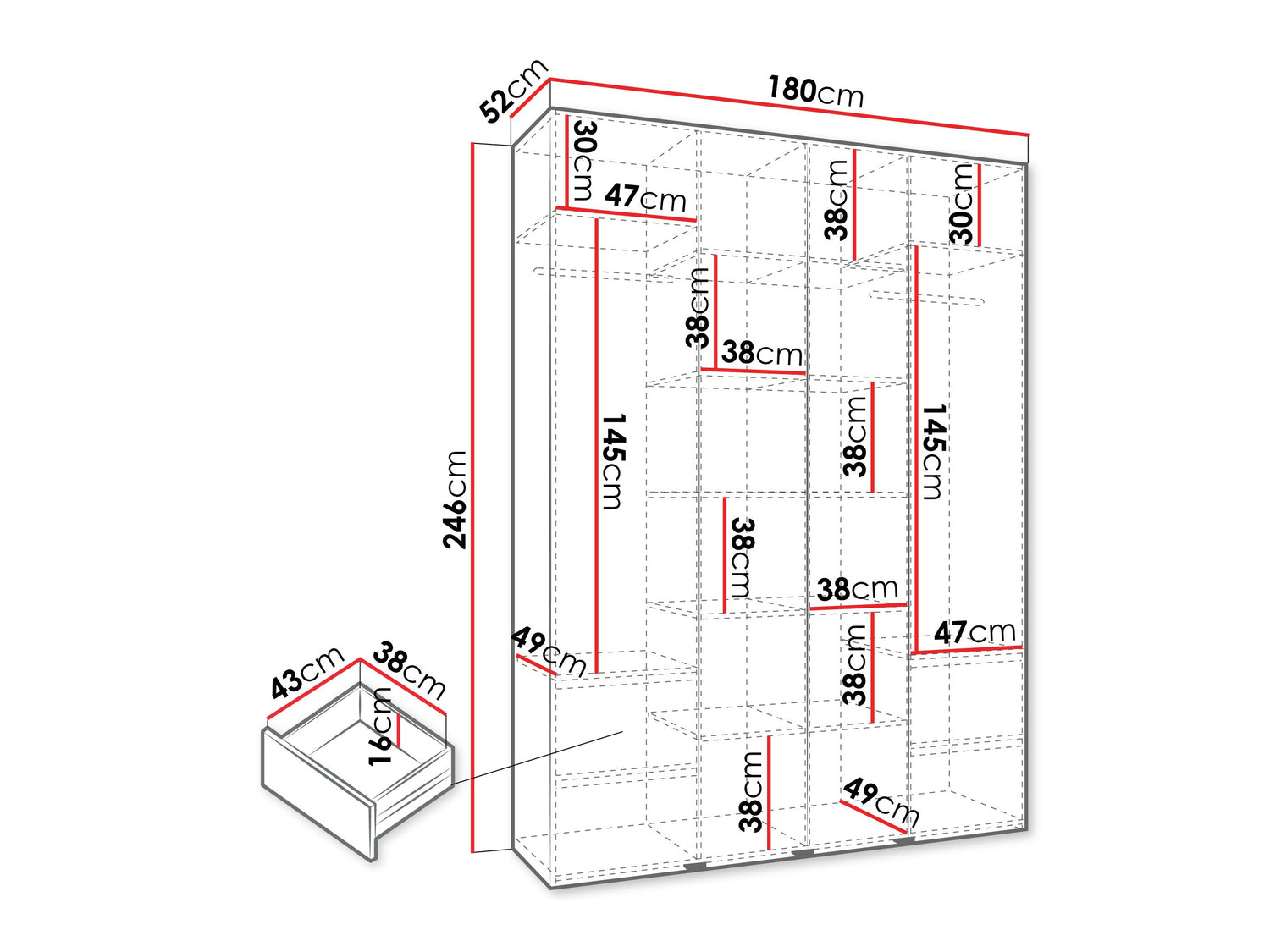 Gardróbszekrény Szafa COMO 2 170/180/190/200 (gł.40/50), Szín: Fehér, Fogantyú színe: Aranysárga, Fiókok: Igen, Szélesség: 180 cm, Mélység: 52 cm