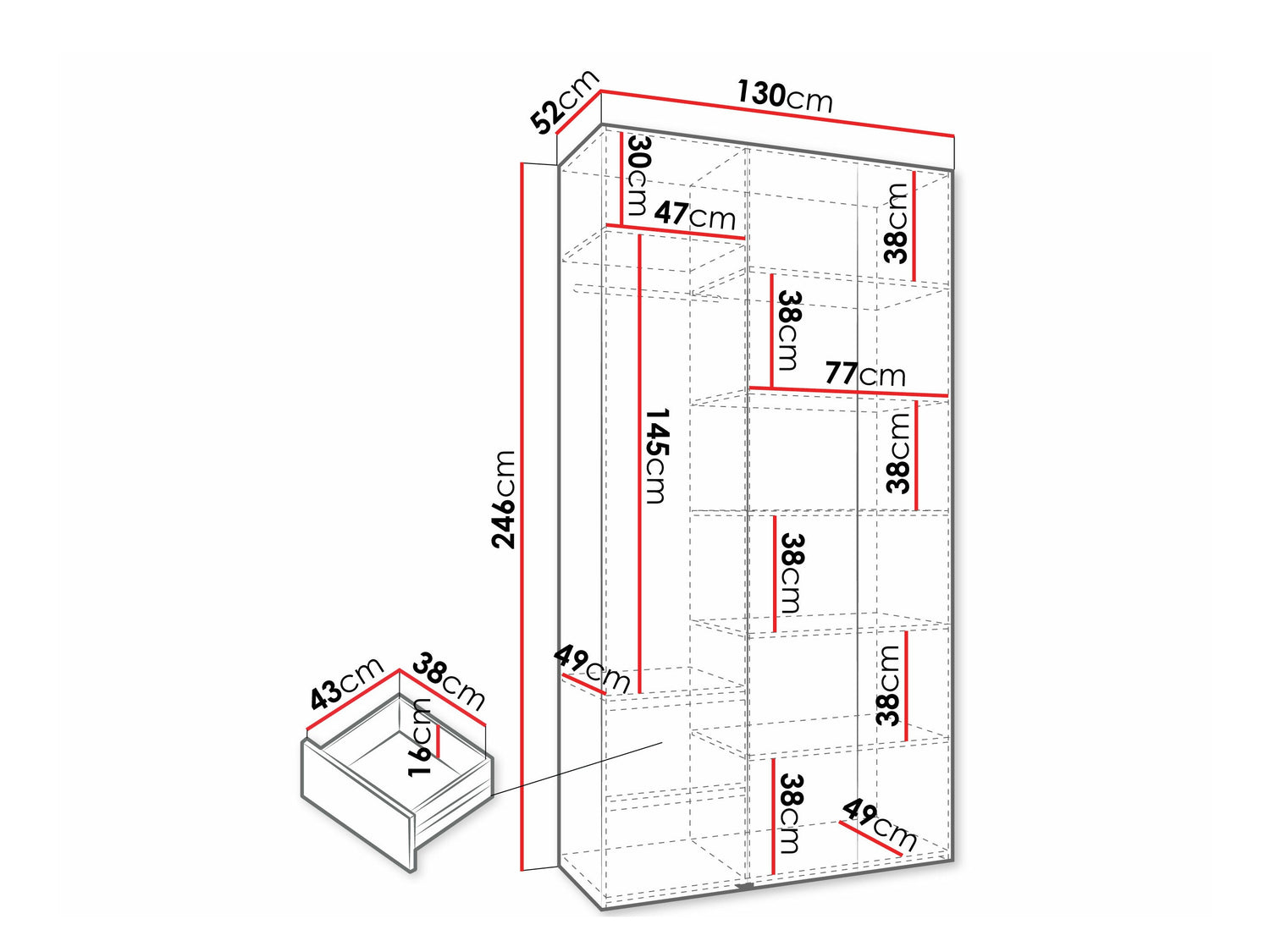 Gardróbszekrény Szafa COMO 3 120/130/140/150/160 (gł.40/50), Szín: Fehér, Fogantyú színe: Fekete, Szélesség: 130 cm, Mélység: 52 cm, Fiókok: Igen