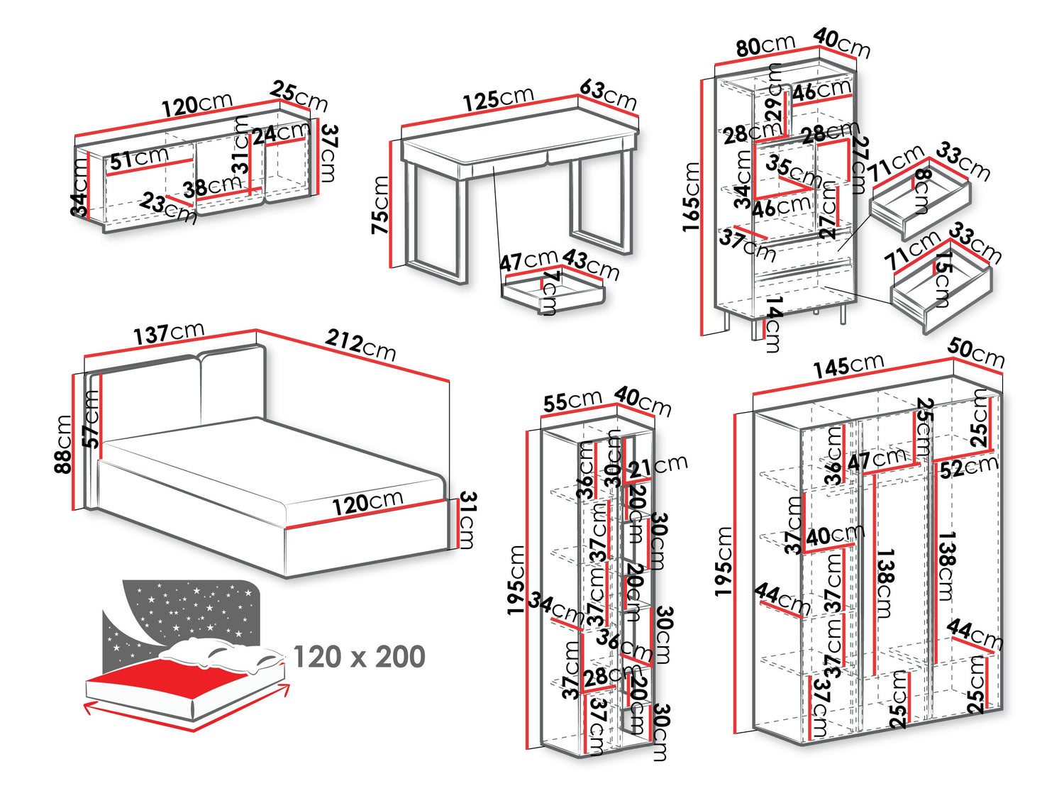 Ágyneműtartó méretei15 x 120 x 201 cm