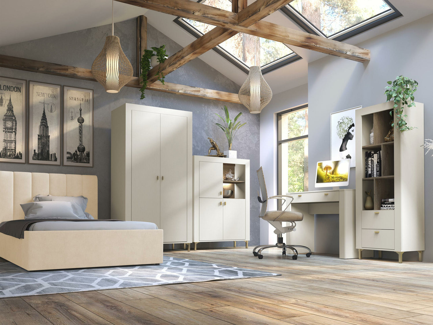Hálószoba garnitúra Meble MOSSA II, A héjbútorok színe: Kasmír, Led világítás: Igen, Ágykeret színe: Cloud 03