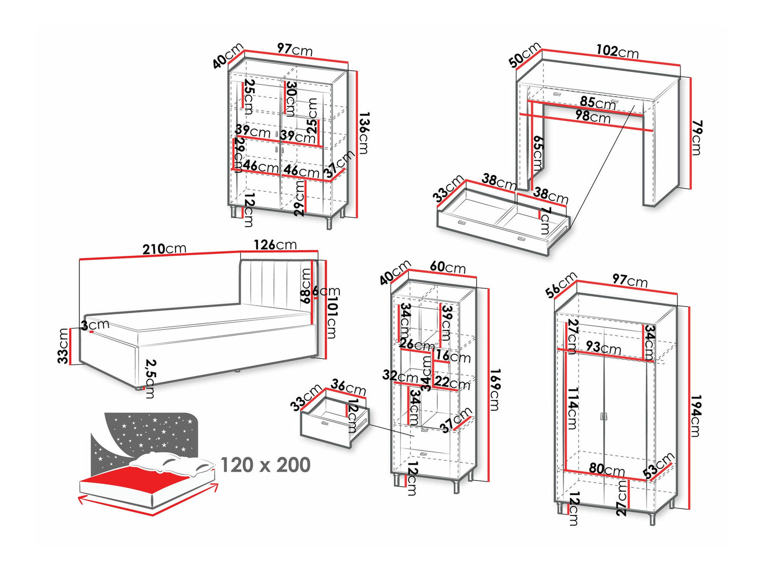 Ágykeret méretei101 x 126 x 210 cm
