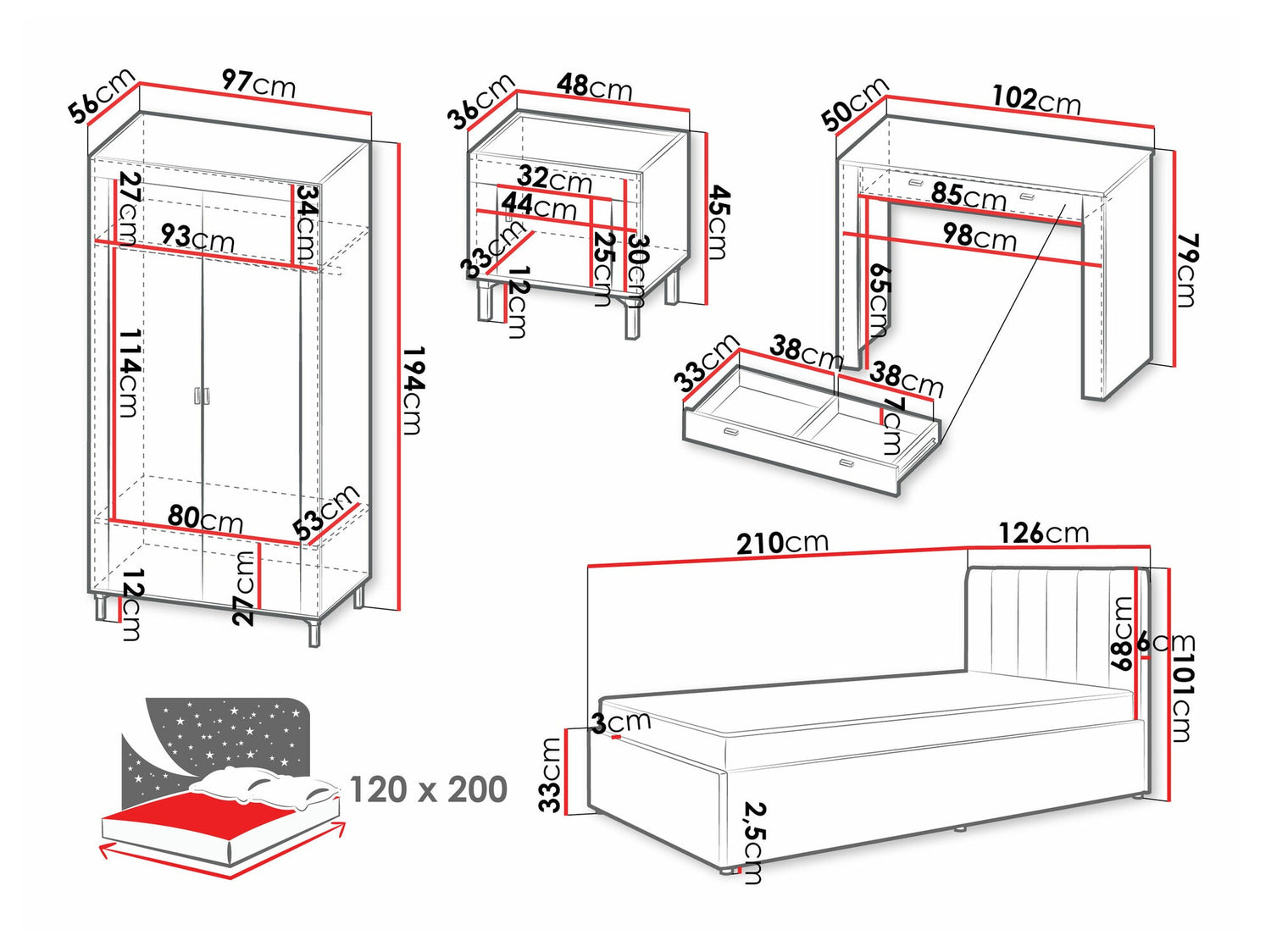 Ágykeret méretei101 x 126 x 210 cm