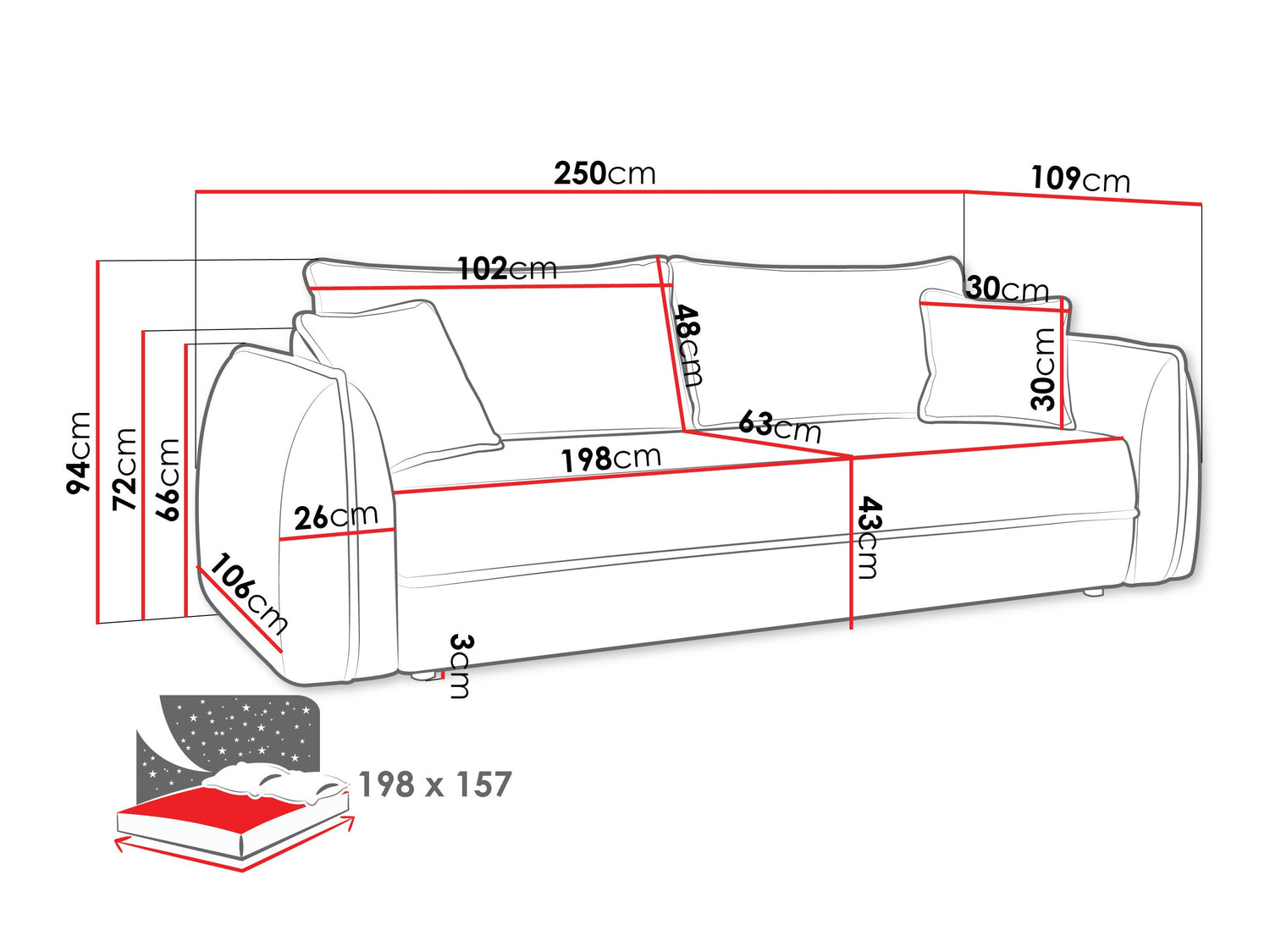 A fekvőfelület hossza198 cm