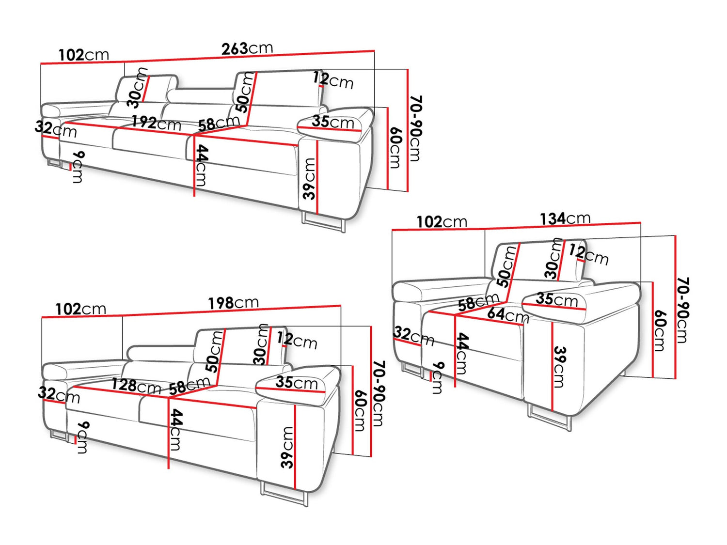 Hármas kanapé méretei70 x 263 x 102 cm