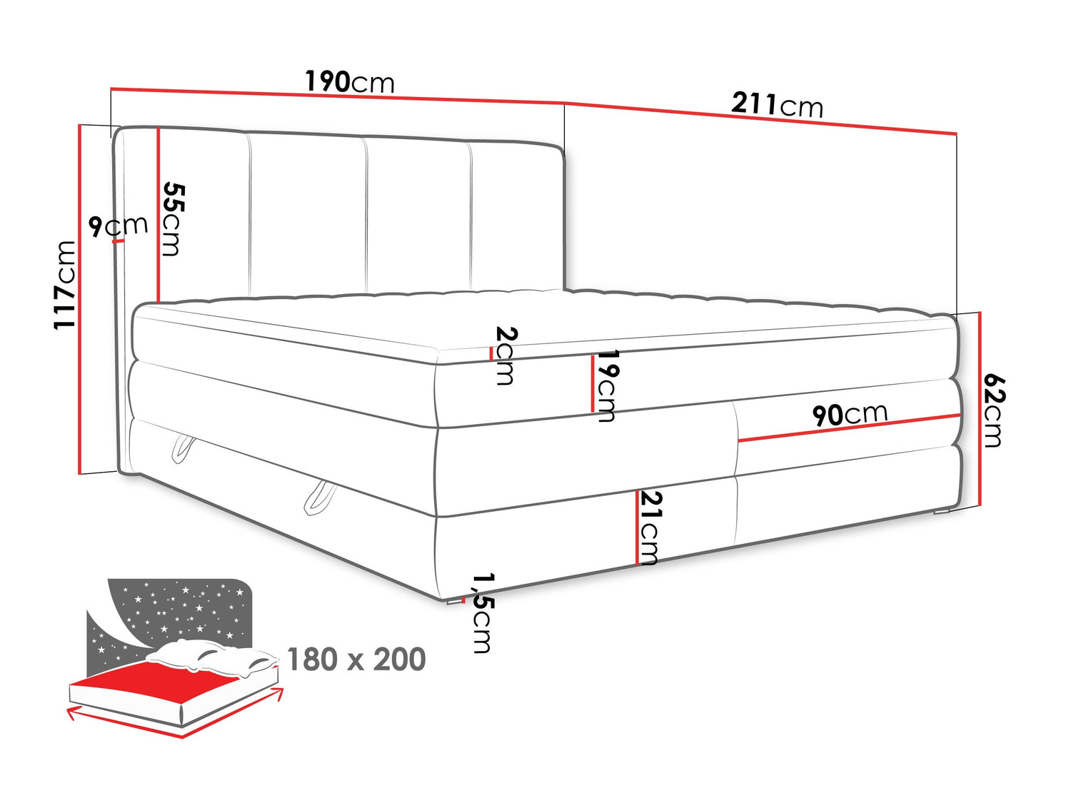 Fejforma méretei117 x 190 x 9 cm