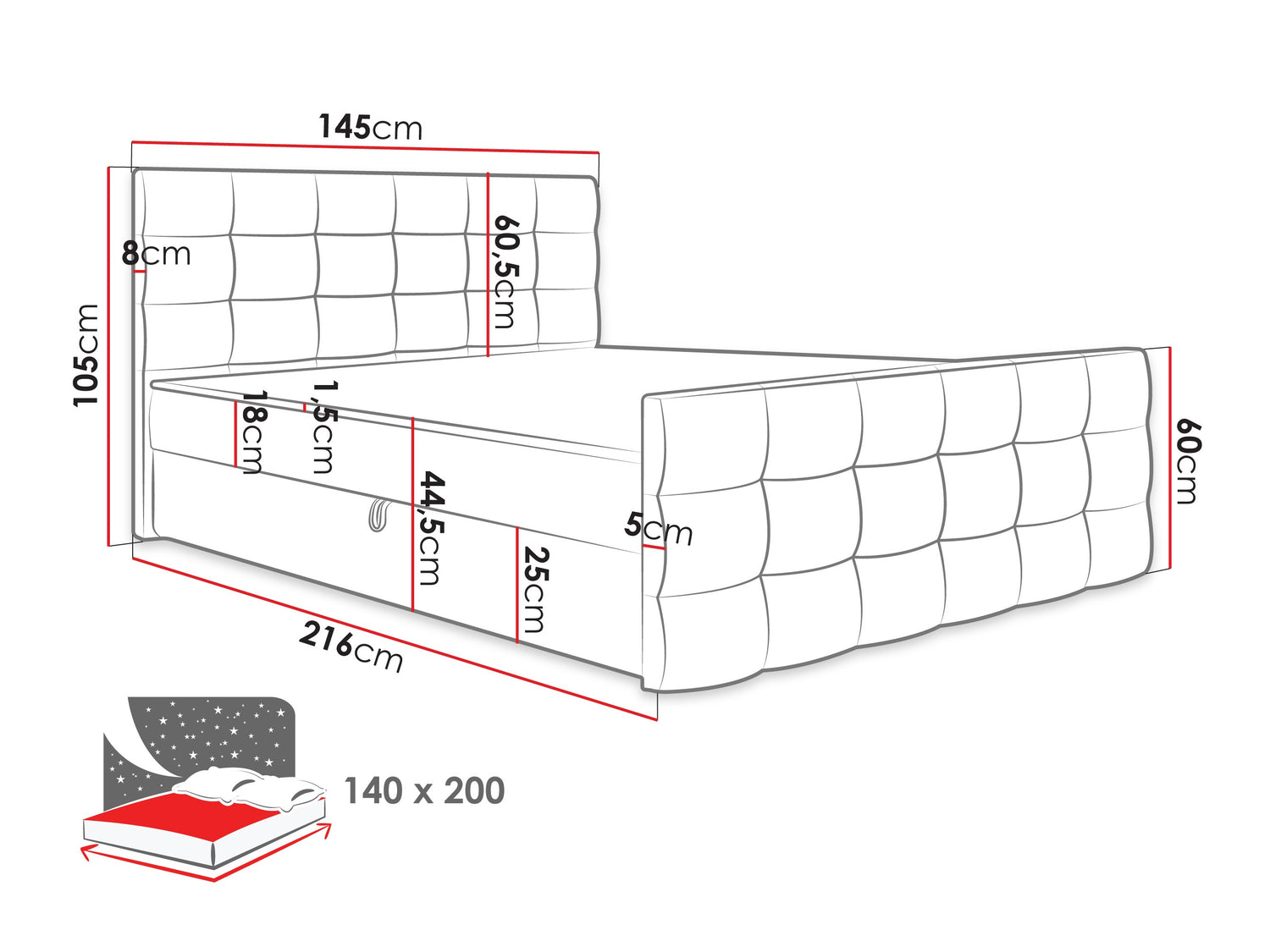Ágyneműtartó méretei25 x 197 x 67 cm