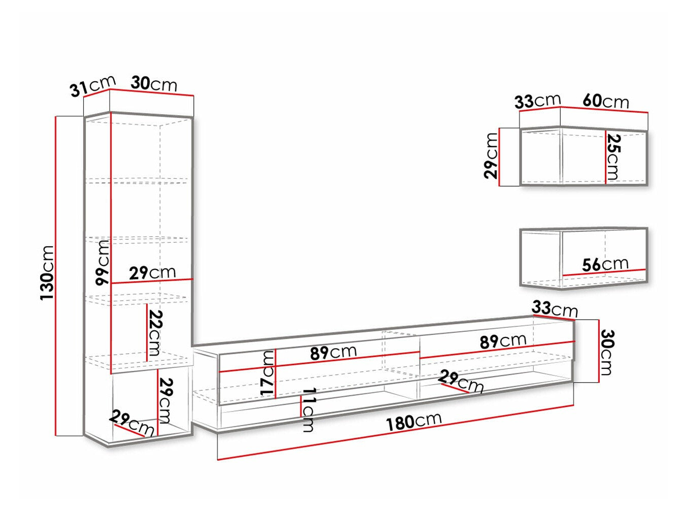 Függő polcméretek130 x 30 x 33 cm