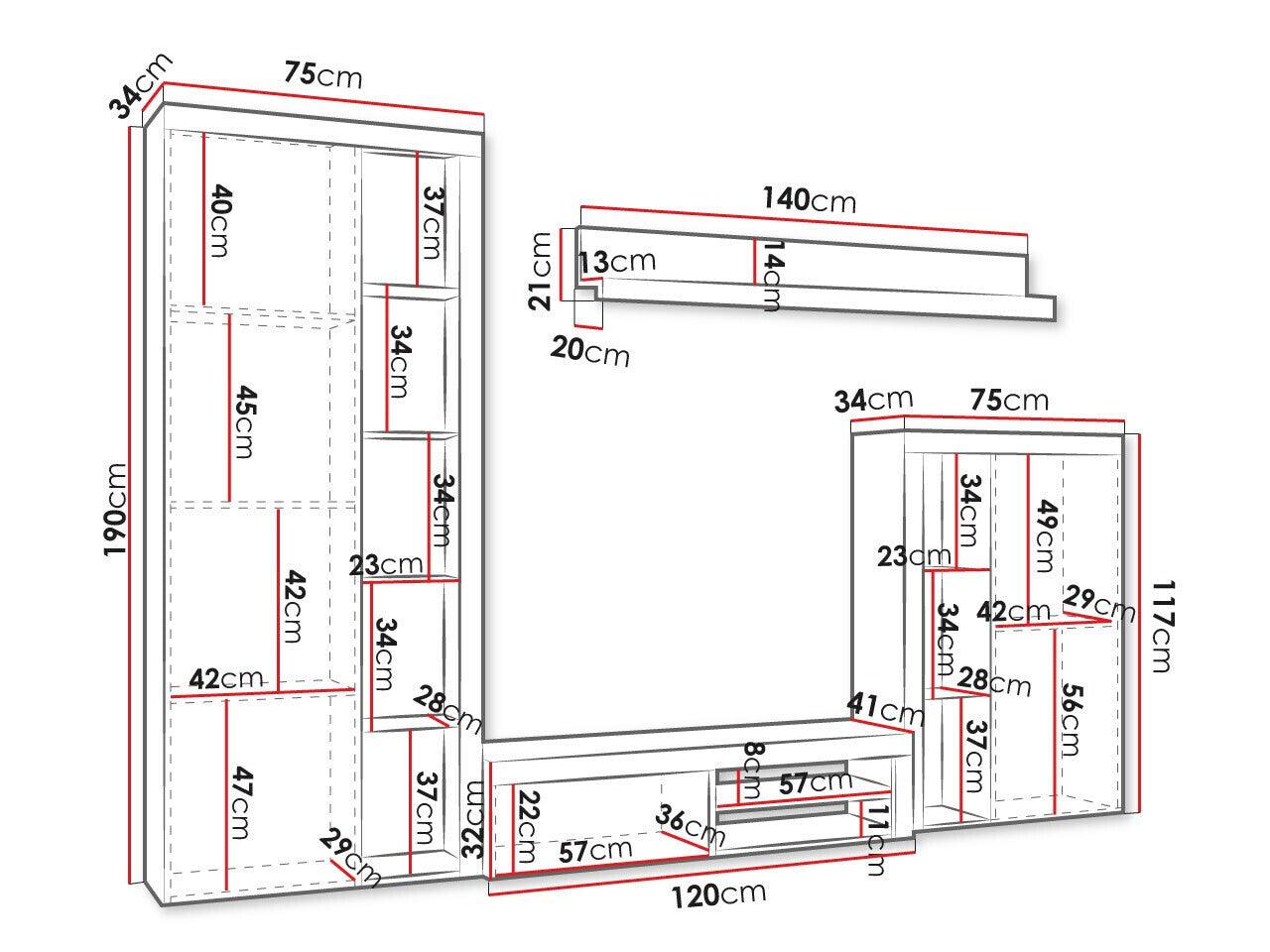 Függő polcméretek21 x 140 x 19 cm