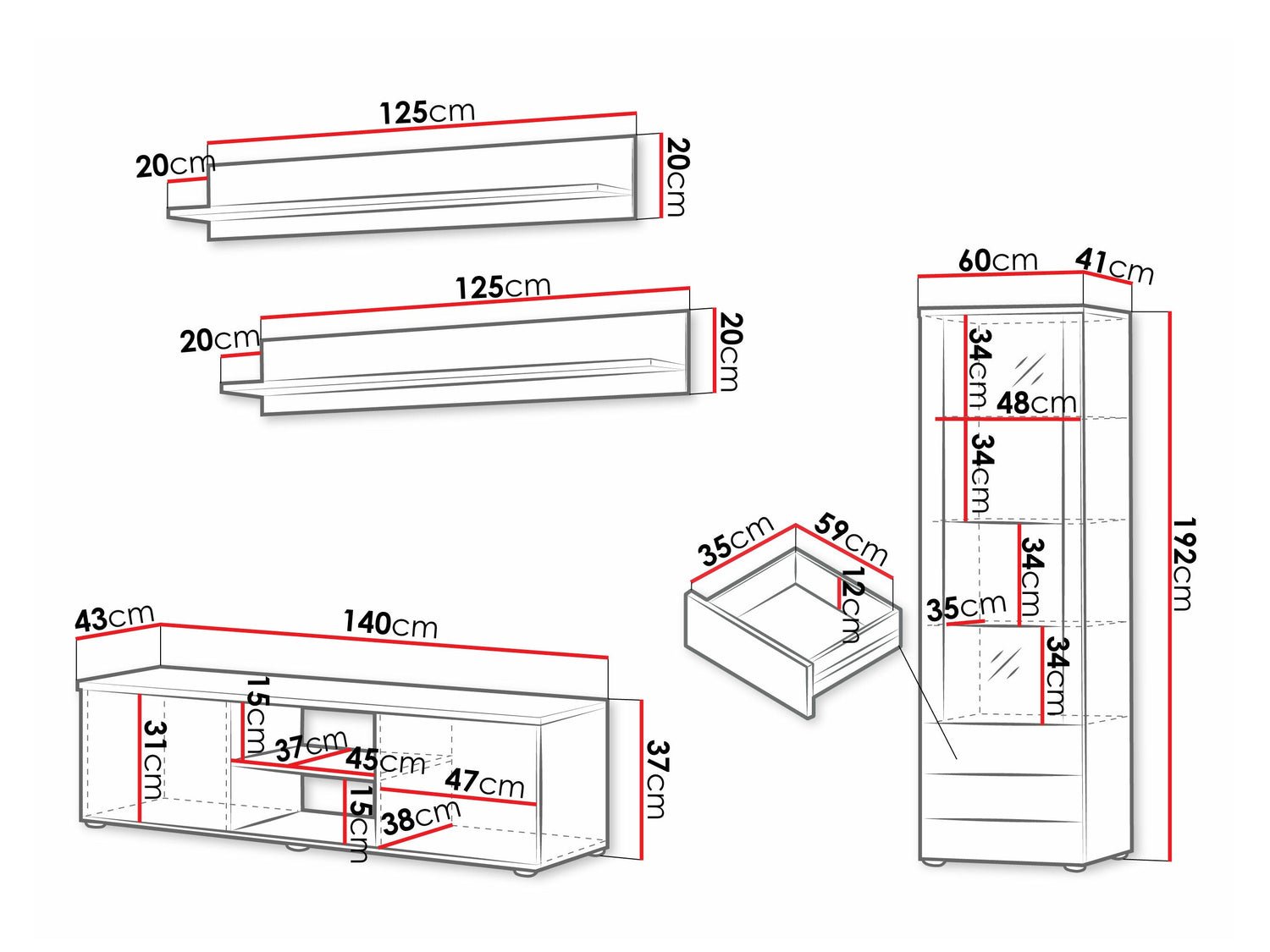 Függő polcméretek20 x 125 x 20 cm