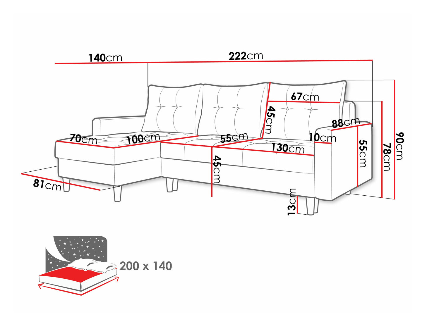 A fekvőfelület szélessége140 cm